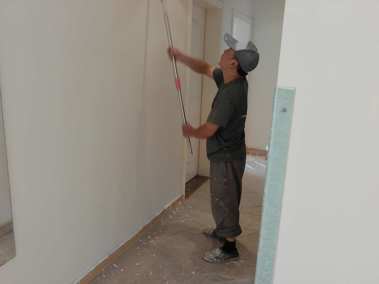 4、上底漆:底漆一定要刷勻,確保墻面每個地方都刷到,如果墻面吃漆量較大,底漆好適量的多加一點水,以確保能夠涂刷均勻。不要因為是底漆以為用差一點的滾筒可以了,底漆的涂刷效果會直接影響面漆的效果,要用跟面漆同樣質(zhì)地滾筒。